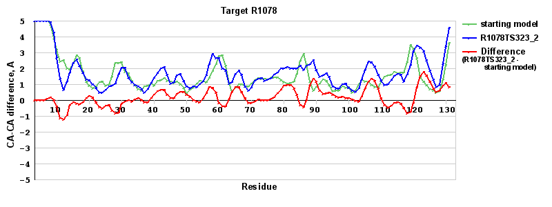 | Red line = (blue line) - (green thick line): difference between the corresponding Refined Model-Target and Starting Model-Target CA-CA distances (see above). Negative values show regions where the reifned model has better fit to the target than the starting model, i.e. areas of potential improvement. |
