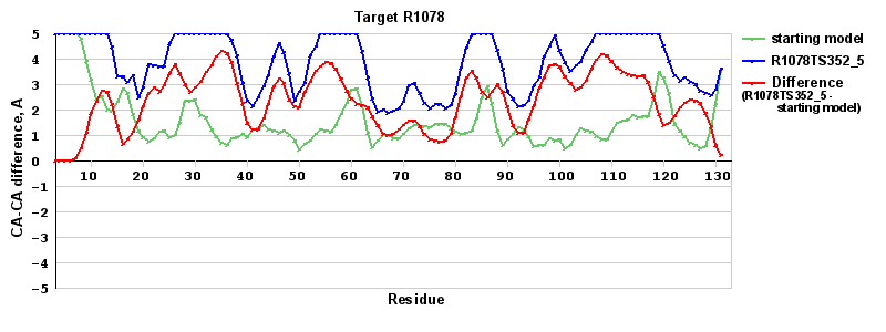 | Green line: distance between the aligned CA atoms in the starting model and the experimental structure in the LGA sequence-independent superposition under the 4A distance cutoff (see LGA description). |
