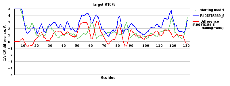| Red line = (blue line) - (green thick line): difference between the corresponding Refined Model-Target and Starting Model-Target CA-CA distances (see above). Negative values show regions where the reifned model has better fit to the target than the starting model, i.e. areas of potential improvement. |