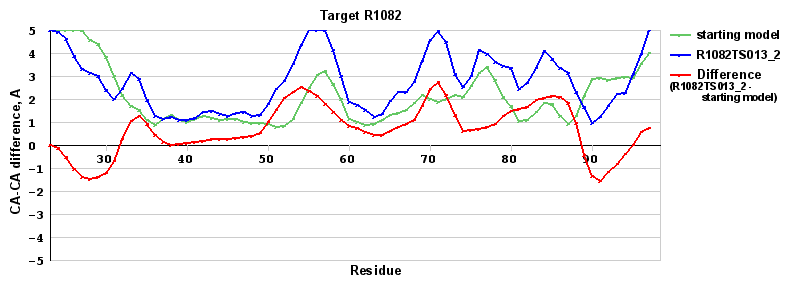 | Red line = (blue line) - (green thick line): difference between the corresponding Refined Model-Target and Starting Model-Target CA-CA distances (see above). Negative values show regions where the reifned model has better fit to the target than the starting model, i.e. areas of potential improvement. |