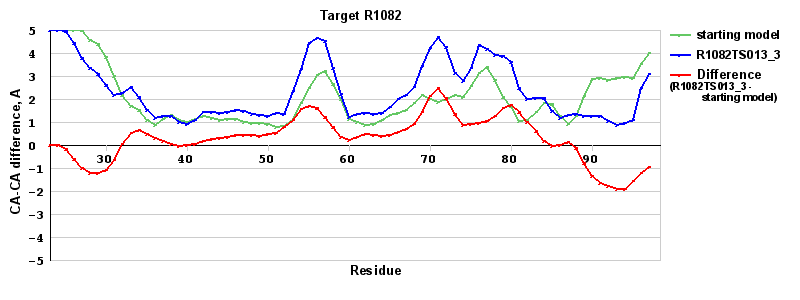 | Red line = (blue line) - (green thick line): difference between the corresponding Refined Model-Target and Starting Model-Target CA-CA distances (see above). Negative values show regions where the reifned model has better fit to the target than the starting model, i.e. areas of potential improvement. |