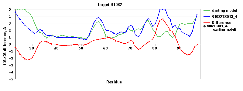 | Green line: distance between the aligned CA atoms in the starting model and the experimental structure in the LGA sequence-independent superposition under the 4A distance cutoff (see LGA description). |