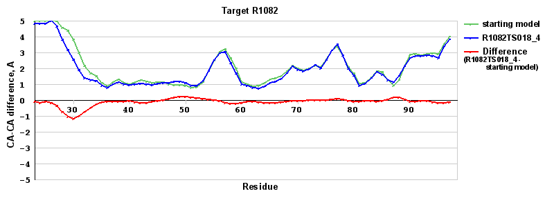 | Red line = (blue line) - (green thick line): difference between the corresponding Refined Model-Target and Starting Model-Target CA-CA distances (see above). Negative values show regions where the reifned model has better fit to the target than the starting model, i.e. areas of potential improvement. |
