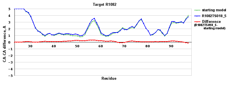 | Red line = (blue line) - (green thick line): difference between the corresponding Refined Model-Target and Starting Model-Target CA-CA distances (see above). Negative values show regions where the reifned model has better fit to the target than the starting model, i.e. areas of potential improvement. |