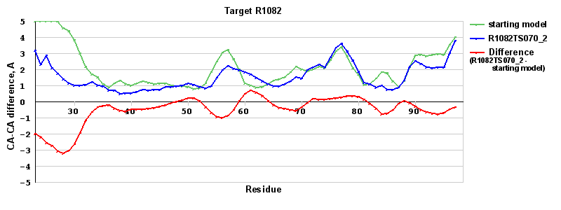 | Red line = (blue line) - (green thick line): difference between the corresponding Refined Model-Target and Starting Model-Target CA-CA distances (see above). Negative values show regions where the reifned model has better fit to the target than the starting model, i.e. areas of potential improvement. |