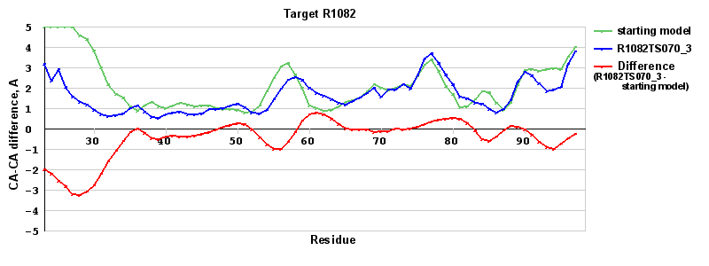 | Red line = (blue line) - (green thick line): difference between the corresponding Refined Model-Target and Starting Model-Target CA-CA distances (see above). Negative values show regions where the reifned model has better fit to the target than the starting model, i.e. areas of potential improvement. |