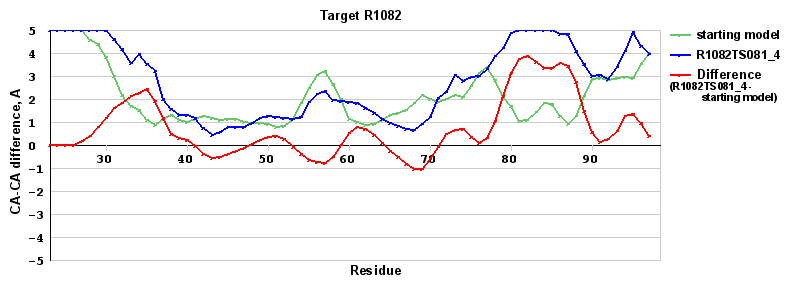 | Red line = (blue line) - (green thick line): difference between the corresponding Refined Model-Target and Starting Model-Target CA-CA distances (see above). Negative values show regions where the reifned model has better fit to the target than the starting model, i.e. areas of potential improvement. |