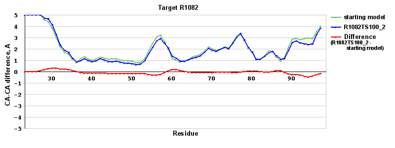 | Red line = (blue line) - (green thick line): difference between the corresponding Refined Model-Target and Starting Model-Target CA-CA distances (see above). Negative values show regions where the reifned model has better fit to the target than the starting model, i.e. areas of potential improvement. |