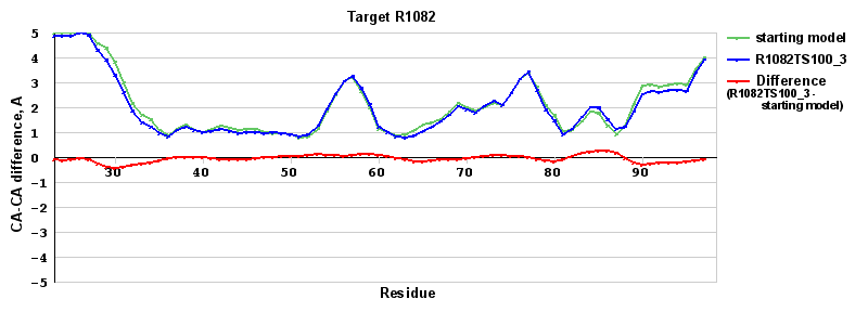 | Red line = (blue line) - (green thick line): difference between the corresponding Refined Model-Target and Starting Model-Target CA-CA distances (see above). Negative values show regions where the reifned model has better fit to the target than the starting model, i.e. areas of potential improvement. |