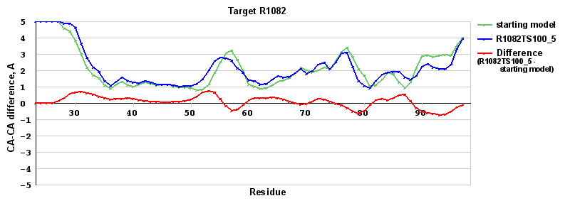 | Red line = (blue line) - (green thick line): difference between the corresponding Refined Model-Target and Starting Model-Target CA-CA distances (see above). Negative values show regions where the reifned model has better fit to the target than the starting model, i.e. areas of potential improvement. |