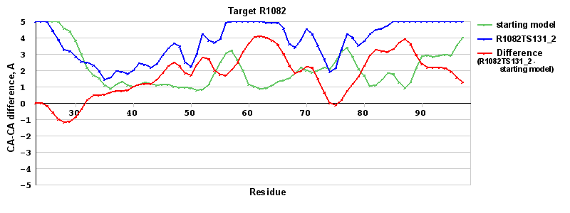 | Red line = (blue line) - (green thick line): difference between the corresponding Refined Model-Target and Starting Model-Target CA-CA distances (see above). Negative values show regions where the reifned model has better fit to the target than the starting model, i.e. areas of potential improvement. |