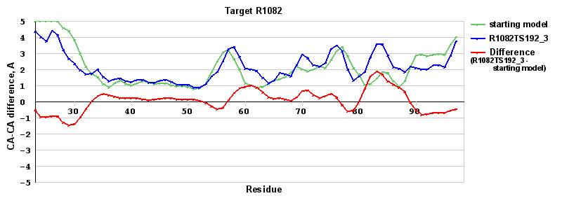 | Red line = (blue line) - (green thick line): difference between the corresponding Refined Model-Target and Starting Model-Target CA-CA distances (see above). Negative values show regions where the reifned model has better fit to the target than the starting model, i.e. areas of potential improvement. |