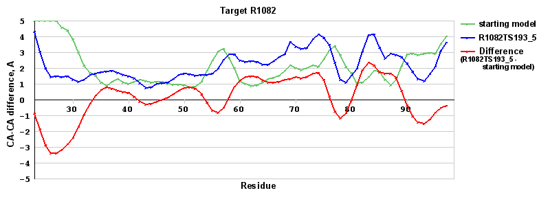 | Red line = (blue line) - (green thick line): difference between the corresponding Refined Model-Target and Starting Model-Target CA-CA distances (see above). Negative values show regions where the reifned model has better fit to the target than the starting model, i.e. areas of potential improvement. |
