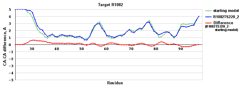 | Red line = (blue line) - (green thick line): difference between the corresponding Refined Model-Target and Starting Model-Target CA-CA distances (see above). Negative values show regions where the reifned model has better fit to the target than the starting model, i.e. areas of potential improvement. |