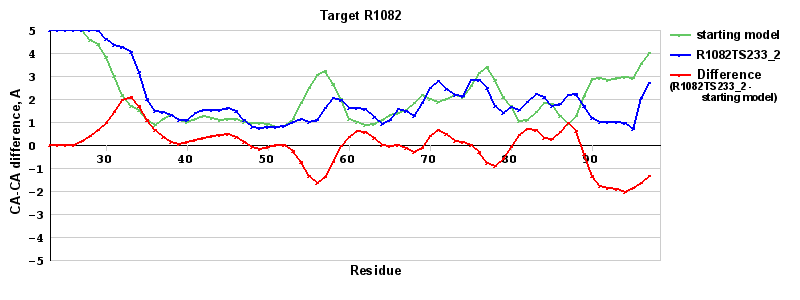| Red line = (blue line) - (green thick line): difference between the corresponding Refined Model-Target and Starting Model-Target CA-CA distances (see above). Negative values show regions where the reifned model has better fit to the target than the starting model, i.e. areas of potential improvement. |