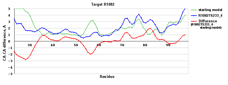 | Red line = (blue line) - (green thick line): difference between the corresponding Refined Model-Target and Starting Model-Target CA-CA distances (see above). Negative values show regions where the reifned model has better fit to the target than the starting model, i.e. areas of potential improvement. |