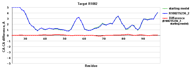 | Red line = (blue line) - (green thick line): difference between the corresponding Refined Model-Target and Starting Model-Target CA-CA distances (see above). Negative values show regions where the reifned model has better fit to the target than the starting model, i.e. areas of potential improvement. |