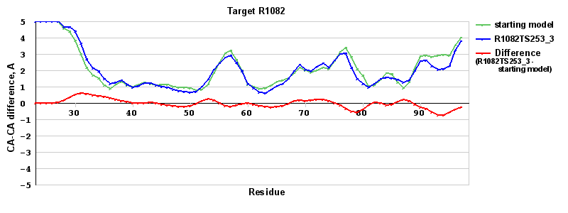 | Red line = (blue line) - (green thick line): difference between the corresponding Refined Model-Target and Starting Model-Target CA-CA distances (see above). Negative values show regions where the reifned model has better fit to the target than the starting model, i.e. areas of potential improvement. |