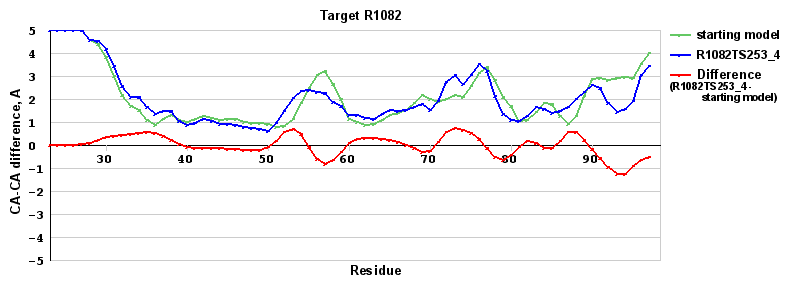 | Red line = (blue line) - (green thick line): difference between the corresponding Refined Model-Target and Starting Model-Target CA-CA distances (see above). Negative values show regions where the reifned model has better fit to the target than the starting model, i.e. areas of potential improvement. |