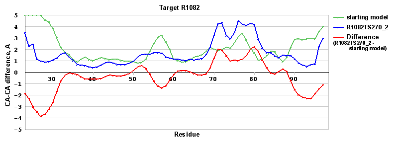 | Red line = (blue line) - (green thick line): difference between the corresponding Refined Model-Target and Starting Model-Target CA-CA distances (see above). Negative values show regions where the reifned model has better fit to the target than the starting model, i.e. areas of potential improvement. |