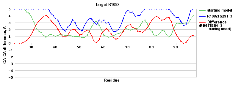 | Red line = (blue line) - (green thick line): difference between the corresponding Refined Model-Target and Starting Model-Target CA-CA distances (see above). Negative values show regions where the reifned model has better fit to the target than the starting model, i.e. areas of potential improvement. |