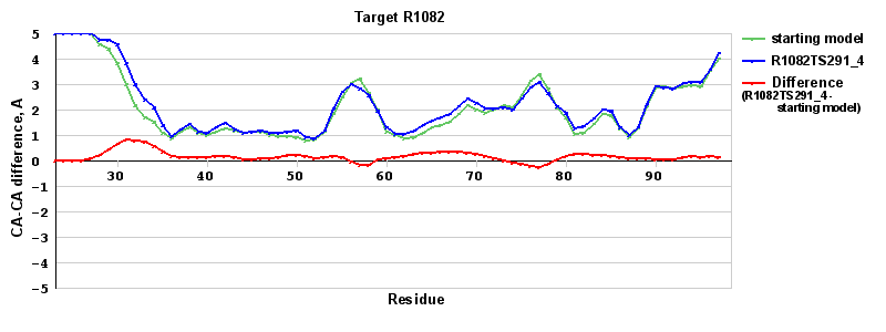 | Red line = (blue line) - (green thick line): difference between the corresponding Refined Model-Target and Starting Model-Target CA-CA distances (see above). Negative values show regions where the reifned model has better fit to the target than the starting model, i.e. areas of potential improvement. |