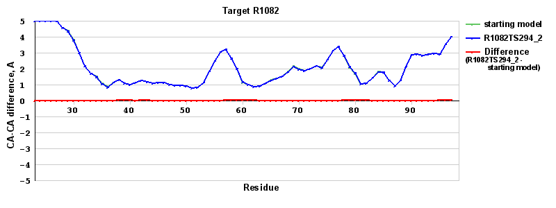 | Green line: distance between the aligned CA atoms in the starting model and the experimental structure in the LGA sequence-independent superposition under the 4A distance cutoff (see LGA description). |