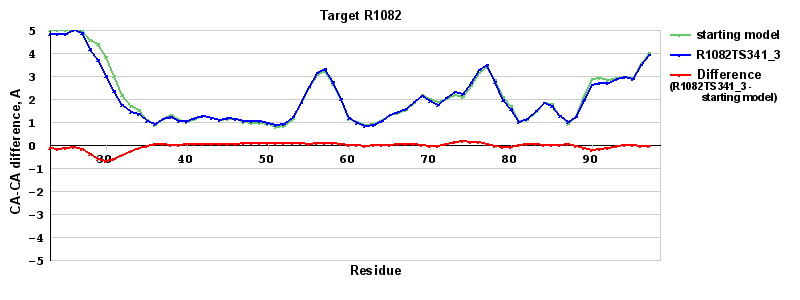 | Red line = (blue line) - (green thick line): difference between the corresponding Refined Model-Target and Starting Model-Target CA-CA distances (see above). Negative values show regions where the reifned model has better fit to the target than the starting model, i.e. areas of potential improvement. |