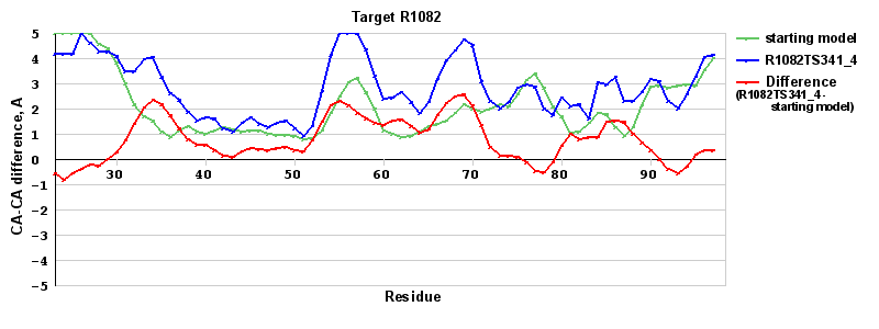 | Red line = (blue line) - (green thick line): difference between the corresponding Refined Model-Target and Starting Model-Target CA-CA distances (see above). Negative values show regions where the reifned model has better fit to the target than the starting model, i.e. areas of potential improvement. |