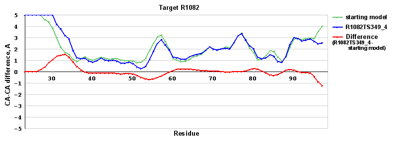 | Red line = (blue line) - (green thick line): difference between the corresponding Refined Model-Target and Starting Model-Target CA-CA distances (see above). Negative values show regions where the reifned model has better fit to the target than the starting model, i.e. areas of potential improvement. |