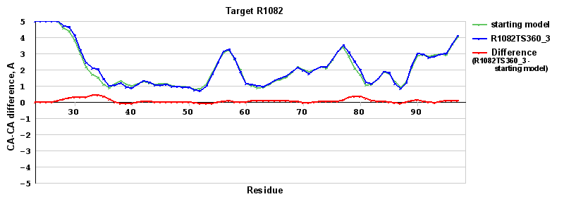| Red line = (blue line) - (green thick line): difference between the corresponding Refined Model-Target and Starting Model-Target CA-CA distances (see above). Negative values show regions where the reifned model has better fit to the target than the starting model, i.e. areas of potential improvement. |