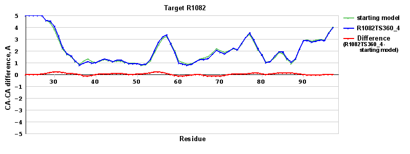 | Red line = (blue line) - (green thick line): difference between the corresponding Refined Model-Target and Starting Model-Target CA-CA distances (see above). Negative values show regions where the reifned model has better fit to the target than the starting model, i.e. areas of potential improvement. |