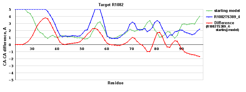 | Green line: distance between the aligned CA atoms in the starting model and the experimental structure in the LGA sequence-independent superposition under the 4A distance cutoff (see LGA description). |