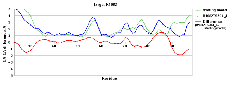 | Red line = (blue line) - (green thick line): difference between the corresponding Refined Model-Target and Starting Model-Target CA-CA distances (see above). Negative values show regions where the reifned model has better fit to the target than the starting model, i.e. areas of potential improvement. |