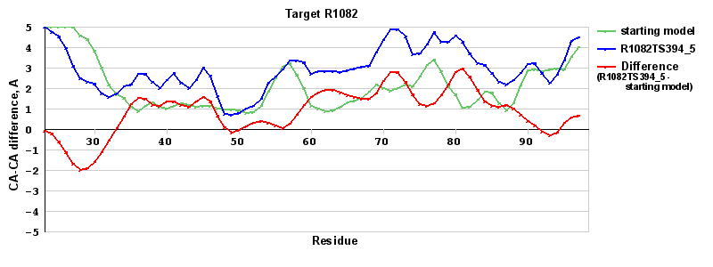 | Red line = (blue line) - (green thick line): difference between the corresponding Refined Model-Target and Starting Model-Target CA-CA distances (see above). Negative values show regions where the reifned model has better fit to the target than the starting model, i.e. areas of potential improvement. |