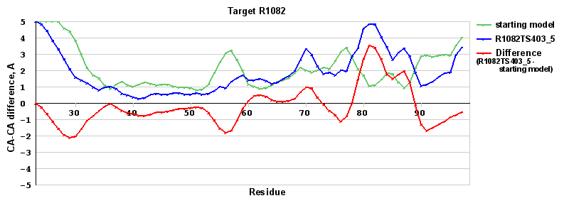 | Red line = (blue line) - (green thick line): difference between the corresponding Refined Model-Target and Starting Model-Target CA-CA distances (see above). Negative values show regions where the reifned model has better fit to the target than the starting model, i.e. areas of potential improvement. |