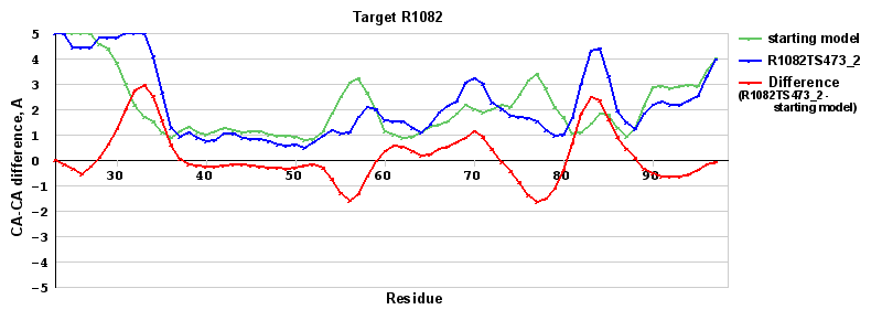 | Red line = (blue line) - (green thick line): difference between the corresponding Refined Model-Target and Starting Model-Target CA-CA distances (see above). Negative values show regions where the reifned model has better fit to the target than the starting model, i.e. areas of potential improvement. |
