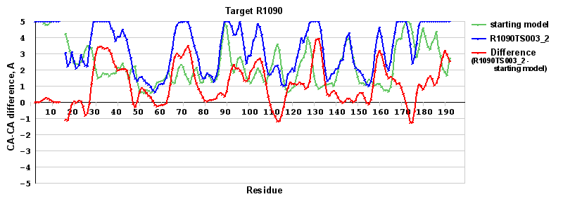 | Red line = (blue line) - (green thick line): difference between the corresponding Refined Model-Target and Starting Model-Target CA-CA distances (see above). Negative values show regions where the reifned model has better fit to the target than the starting model, i.e. areas of potential improvement. |