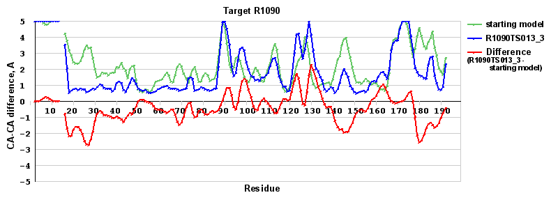 | Red line = (blue line) - (green thick line): difference between the corresponding Refined Model-Target and Starting Model-Target CA-CA distances (see above). Negative values show regions where the reifned model has better fit to the target than the starting model, i.e. areas of potential improvement. |
