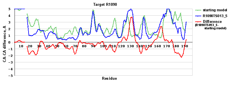 | Red line = (blue line) - (green thick line): difference between the corresponding Refined Model-Target and Starting Model-Target CA-CA distances (see above). Negative values show regions where the reifned model has better fit to the target than the starting model, i.e. areas of potential improvement. |