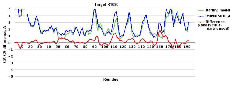 | Red line = (blue line) - (green thick line): difference between the corresponding Refined Model-Target and Starting Model-Target CA-CA distances (see above). Negative values show regions where the reifned model has better fit to the target than the starting model, i.e. areas of potential improvement. |