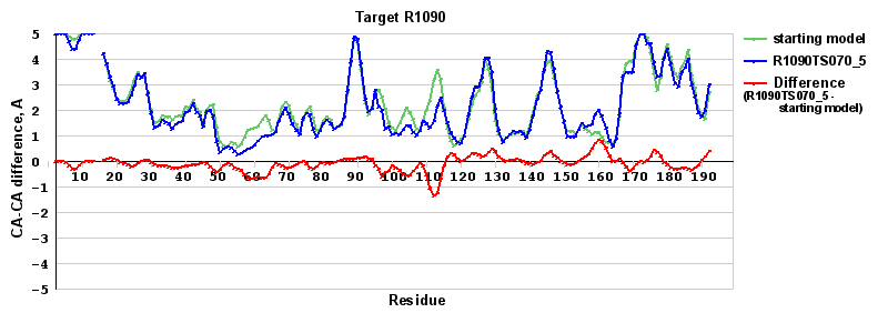 | Red line = (blue line) - (green thick line): difference between the corresponding Refined Model-Target and Starting Model-Target CA-CA distances (see above). Negative values show regions where the reifned model has better fit to the target than the starting model, i.e. areas of potential improvement. |