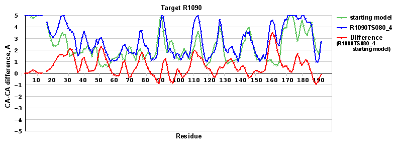 | Red line = (blue line) - (green thick line): difference between the corresponding Refined Model-Target and Starting Model-Target CA-CA distances (see above). Negative values show regions where the reifned model has better fit to the target than the starting model, i.e. areas of potential improvement. |