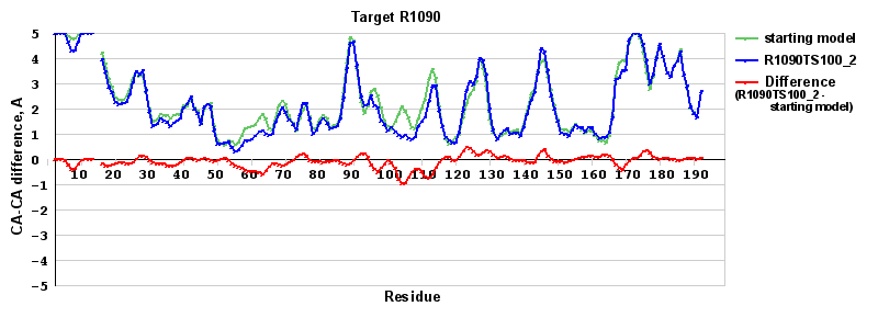 | Red line = (blue line) - (green thick line): difference between the corresponding Refined Model-Target and Starting Model-Target CA-CA distances (see above). Negative values show regions where the reifned model has better fit to the target than the starting model, i.e. areas of potential improvement. |