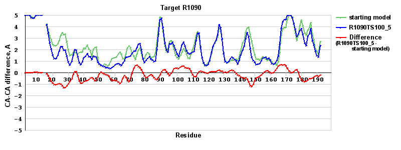 | Red line = (blue line) - (green thick line): difference between the corresponding Refined Model-Target and Starting Model-Target CA-CA distances (see above). Negative values show regions where the reifned model has better fit to the target than the starting model, i.e. areas of potential improvement. |