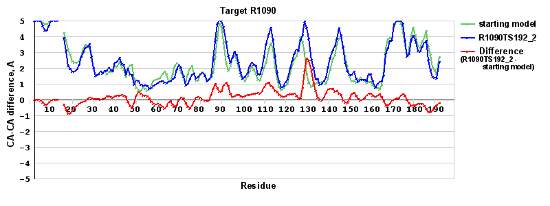| Red line = (blue line) - (green thick line): difference between the corresponding Refined Model-Target and Starting Model-Target CA-CA distances (see above). Negative values show regions where the reifned model has better fit to the target than the starting model, i.e. areas of potential improvement. |