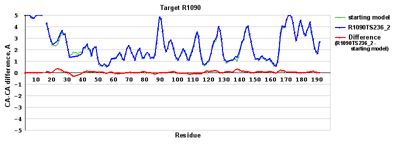 | Red line = (blue line) - (green thick line): difference between the corresponding Refined Model-Target and Starting Model-Target CA-CA distances (see above). Negative values show regions where the reifned model has better fit to the target than the starting model, i.e. areas of potential improvement. |