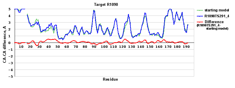 | Red line = (blue line) - (green thick line): difference between the corresponding Refined Model-Target and Starting Model-Target CA-CA distances (see above). Negative values show regions where the reifned model has better fit to the target than the starting model, i.e. areas of potential improvement. |