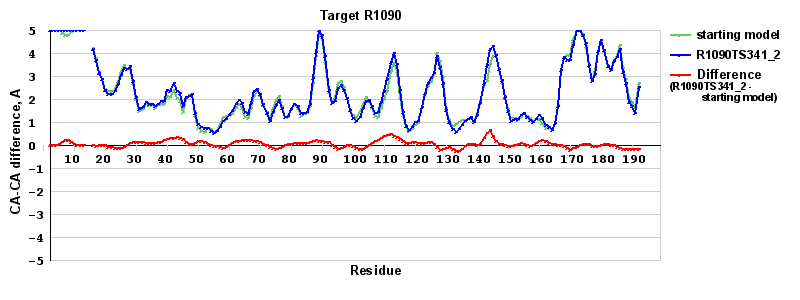 | Red line = (blue line) - (green thick line): difference between the corresponding Refined Model-Target and Starting Model-Target CA-CA distances (see above). Negative values show regions where the reifned model has better fit to the target than the starting model, i.e. areas of potential improvement. |