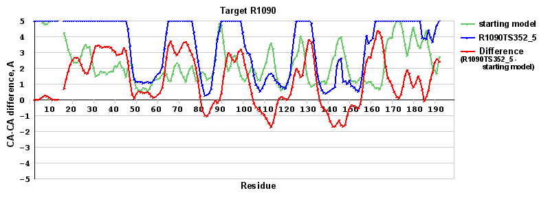 | Red line = (blue line) - (green thick line): difference between the corresponding Refined Model-Target and Starting Model-Target CA-CA distances (see above). Negative values show regions where the reifned model has better fit to the target than the starting model, i.e. areas of potential improvement. |